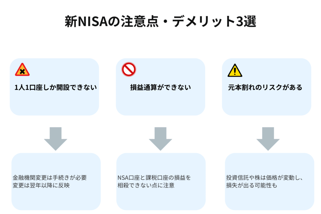 一方で1人1口座しか開設できないことや、損益通算・繰越控除が適用されないなど、注意点も存在します。